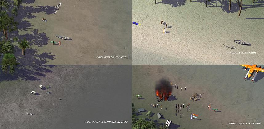 This pack includes 4 custom Beach Mods styled to resemble real world locales: Cape Cod, Nantucket, Vancouver Island and St. Lucia. Each beach comes in two different scale variations: choose the version that matches the terrain mod you may be using (see INFORMATION below for further details).