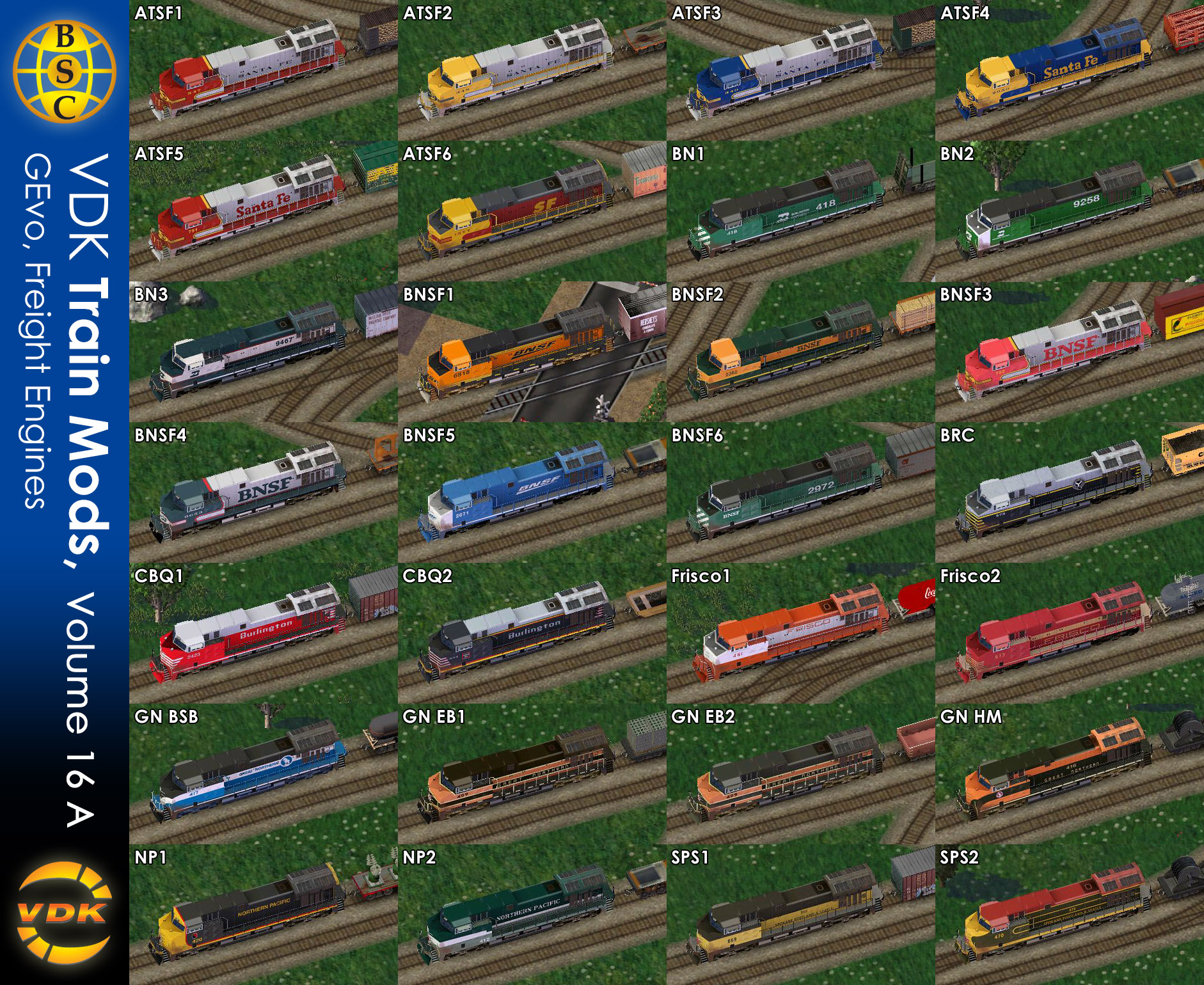 The SC4D LEX Legacy - BSC VDK Train Mods Vol16 and Vol17 North American, GEvo and EMD-F9 Freight Engines by vester contains the following 9 formerly available Freight Rail automata mods: